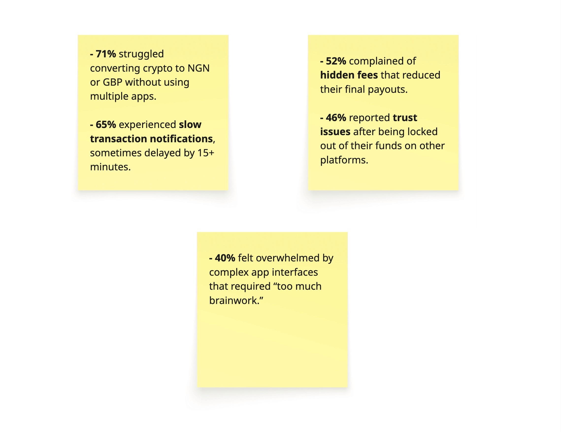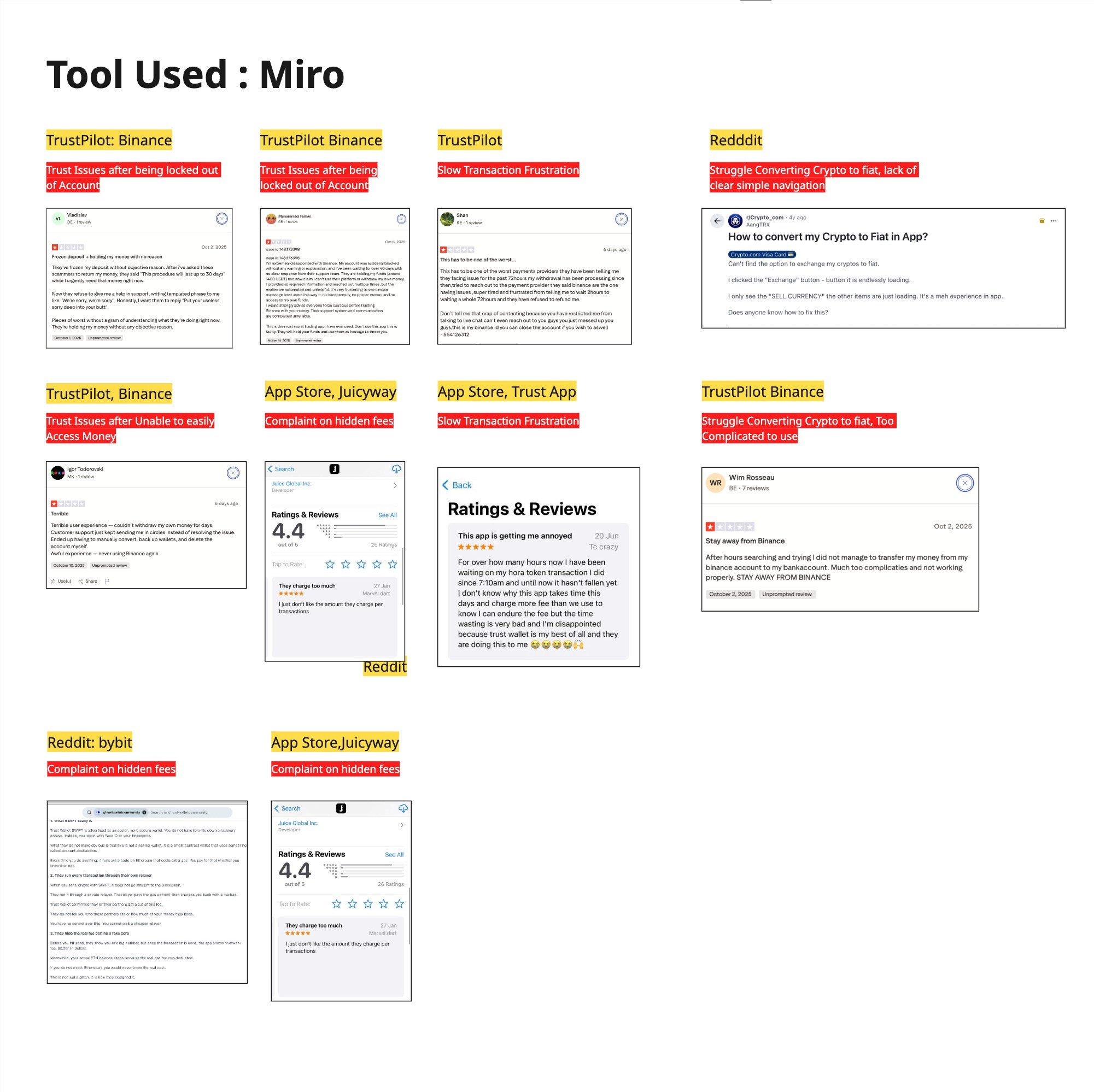 To understand real pain points users face with existing money transfer and crypto platforms, I analyzed over 100+ public reviews across Trustpilot, App Store, Play Store, and Reddit.