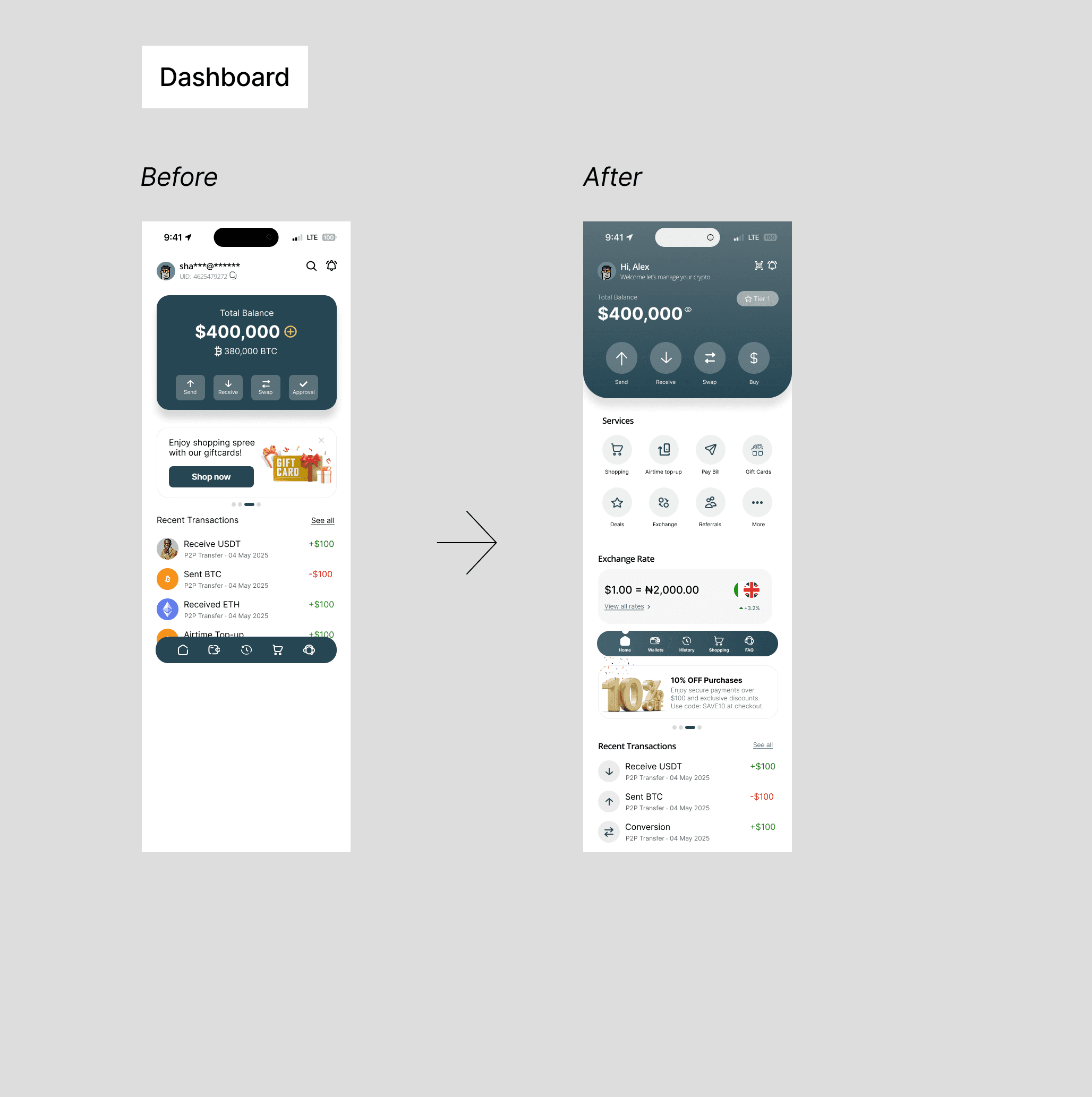 In the first design iteration, the goal was to create a functional and visually clean interface that gave users access to core features like Send Money, Wallet, Giftcards, and Exchange Rates.