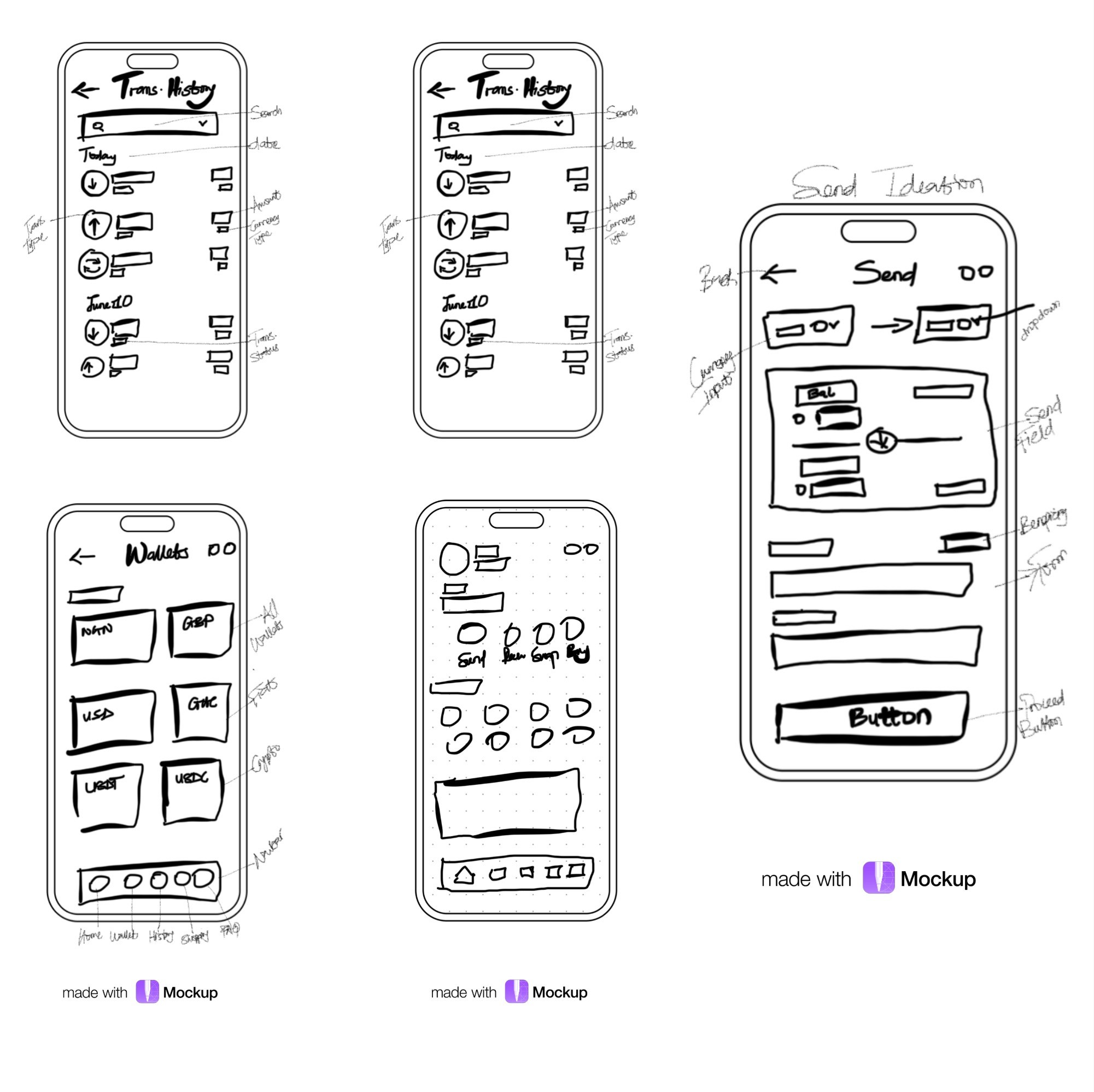 Sketched early layout ideas for onboarding, dashboard, and transaction flows.