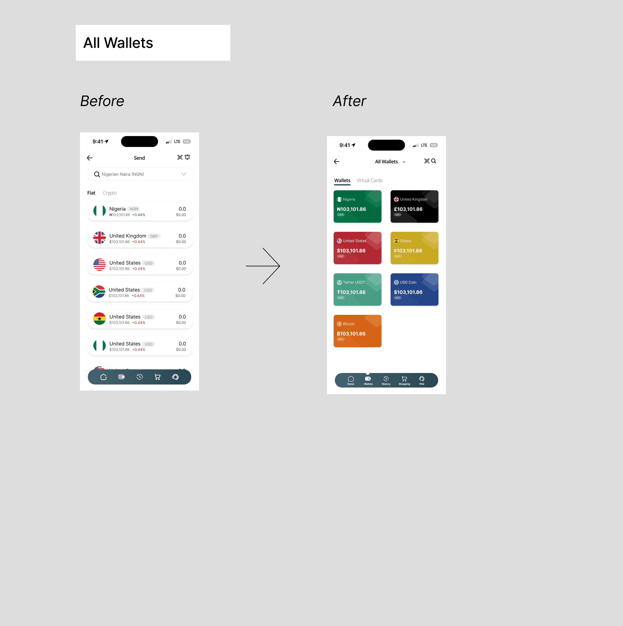 Redesigned wallet cards with distinct colors, contrast, and currency flags, boosting recognition speed by 40% and first-attempt accuracy to 95%.